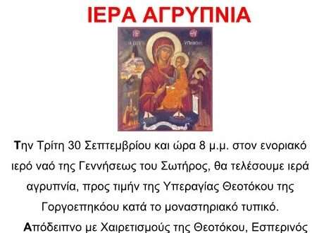 θα τελεσθεί ιερά Αγρυπνία (Εσπερινός με Λιτή, Αρτοκλασία, Όρθρος με Αγιασμό και Θεία Λειτουργία) για την εορτή της Συνάξεως της Υπεραγίας Θεοτόκου της Γοργοεπηκόου.