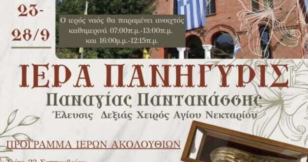 Ιεράς Πανηγύρεως της Παναγίας Παντανάσσης την άφθαρτο δεξιά χείρα του Αγίου Νεκταρίου Επισκόπου Πενταπόλεως. Το ιερό λείψανο θα παραμείνει στον ναό από τις 23 Σεπτεμβρίου έως τις 28 Σεπτεμβρίου 2025. Θα τελούνται καθημερινά ιερές ακολουθίες σύμφωνα με το παρακάτω πρόγραμμα.