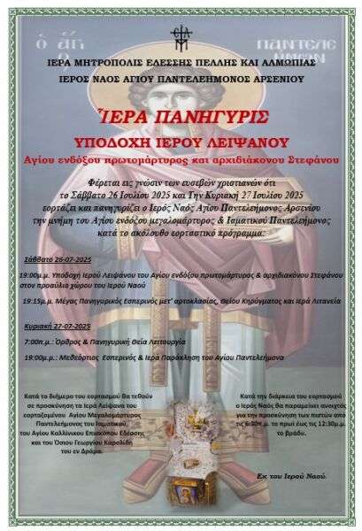 Την Κυριακή 27 Ιουλίου πανηγυρίζει ο Ιερός Ναός Αγίου Παντελεήμονος στο Αρσένι Σκύδρας