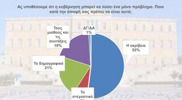 Στο ερώτημα για το αν η χώρα κινείται στη σωστή ή στη λάθος κατεύθυνση, το 67% απαντά ότι βρίσκεται σε λάθος τροχιά, ενώ το 30% δηλώνει ότι κινείται προς τη σωστή κατεύθυνση μάλιστα, σε ένα υποθετικό σενάριο όπου η κυβέρνηση μπορεί να λύσει μόνο ένα πρόβλημα, το 52% επιλέγει την ακρίβεια ως απόλυτη προτεραιότητα. Ακολουθούν το δημογραφικό (21%), οι μισθοί και συντάξεις (19%) και το στεγαστικό (7%).