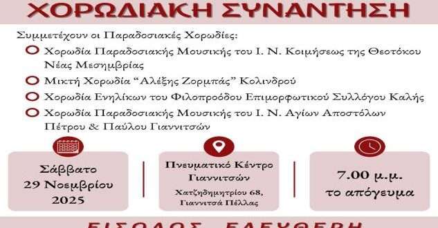 διοργανώνει την πρώτη συνάντηση χορωδιών 29/11 στο Πνευματικό Κέντρο Γιαννιτσών 7μ.μ