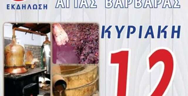 σας προσκαλούνε, την Κυριακή 12 Οκτωβρίου 2025 στην 8η Εκδήλωση Παραδοσιακής Παραγωγής Τσίπουρο Αγίας Βαρβάρας στην πλατεία της ΤΚ στις 12:00μ.μ. .