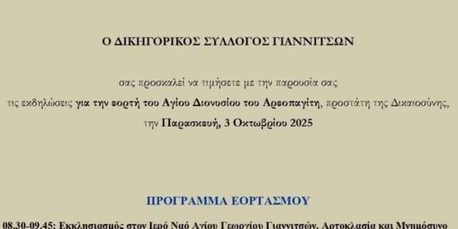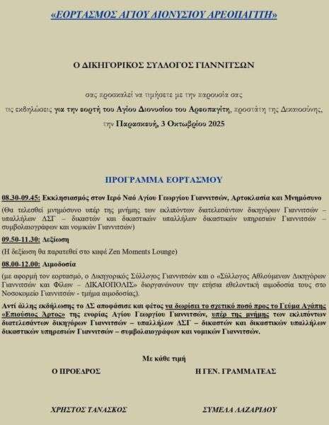 Ο Δικηγορικός Σύλλογος Γιαννιτσών τιμά και φέτος τη μνήμη του Αγίου Διονυσίου του Αρεοπαγίτη,