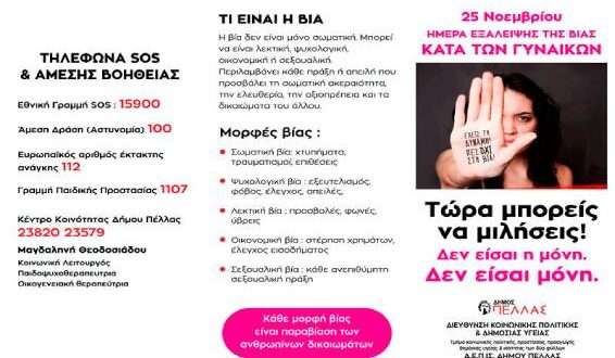 η Δημοτική Επιτροπή Ισότητας Φύλων (Δ.Ε.Π.ΙΣ.) του Δήμου Πέλλας υλοποιεί δράση ενημέρωσης και ευαισθητοποίησης με στόχο την ενίσχυση της πρόληψης και την αποτελεσματική αντιμετώπιση του ειδεχθούς φαινομένου της έμφυλης βίας. Η δράση απευθύνεται σε όλες τις γυναίκες, αλλά και στο σύνολο της τοπικής κοινωνίας, καθώς η βία κατά των γυναικών αποτελεί ζήτημα δημοκρατίας, κοινωνικής συνοχής και συλλογικής ευημερίας.