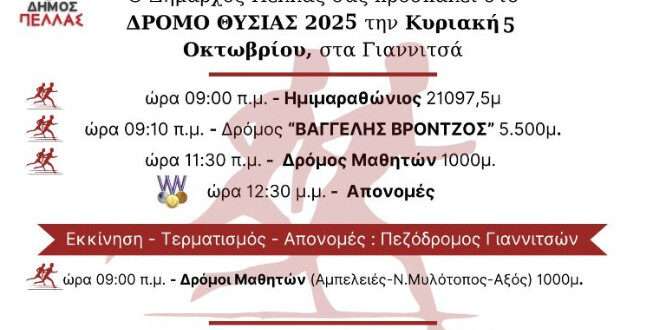 Με σύμμαχο τις προβλέψεις για μια ηλιόλουστη μέρα και με τη συνεργασία όλων, η διοργάνωση του «Δρόμου Θυσίας Γιαννιτσών 2025» της Κυριακής 5 Οκτωβρίου, αναμένεται να «σφραγίσει» τον χαρακτηρισμό της ως η μεγαλύτερη αθλητική γιορτή του Δήμου Πέλλας.
