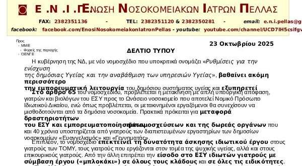 Η Ένωση Νοσοκομειακών Ιατρών Πέλλας εκφράζει την αντίθεση της στην παραπέρα εμπορευματοποίηση που προωθεί το συγκεκριμένο νομοσχέδιο και απαιτεί να αποσύρει άμεσα η επίμαχη διάταξη! Καλούμε τον Υπουργό να πάρει δημόσια θέση και να σταματήσει τώρα αυτές τις μεθοδεύσεις που προσβάλλουν τους αγώνες και την αξιοπρέπεια των νοσοκομειακών γιατρών.