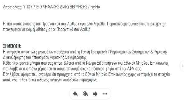 Αν δε σας έχει ήδη αποδοθεί Προσωπικός Αριθμός, επιβεβαιώvετε τα ταυτοποιητικά σας στοιχεία και ο Προσωπικός Αριθμός σας αποδίδεται αυτόματα… μας ενημερώνει το Υπ. Ψηφιακής Διακυβέρνησης, οπότε βγάλαμε ή όχι… ήρθε…