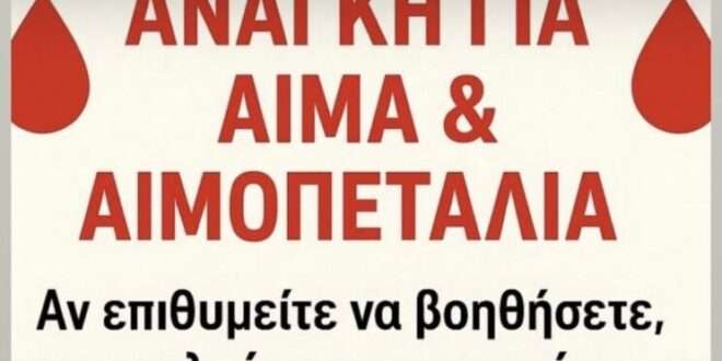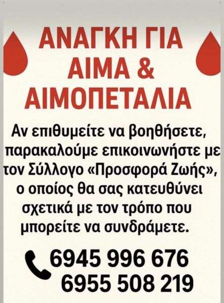 Φίλες και φίλοι, υπάρχει ανάγκη για αίμα και αιμοπετάλια, στον αγώνα που δίνει για το παιδί της, μια οικογένεια του τόπου μας. Είμαστε σίγουροι ότι η μάχη θα κερδηθεί. Η σκέψη μας, αλλά και οι πράξεις μας είναι μαζί σας.