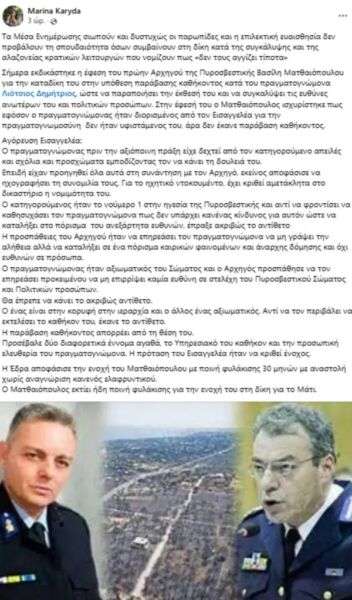 Την είδηση γνωστοποίησε η συγγραφέας βιβλίου για το Μάτι, Μαρίνα Καρύδα με ανάρτησή της στα social media: «Σήμερα εκδικάστηκε η έφεση του πρώην Αρχηγού της Πυροσβεστικής Βασίλη Ματθαιόπουλου για την καταδίκη του στην υπόθεση παράβασης καθήκοντος κατά του πραγματογνώμονα Λιότσιος Δημήτριος, ώστε να παραποιήσει την έκθεσή του και να συγκαλύψει τις ευθύνες ανωτέρων του και πολιτικών προσώπων. Στην έφεσή του ο Ματθαιόπουλος ισχυρίστηκε πως εφόσον ο πραγματογνώμονας ήταν διορισμένος από τον Εισαγγελέα για την πραγματογνωμοσύνη δεν ήταν υφιστάμενος του, άρα δεν έκανε παράβαση καθήκοντος», αναφέρει μεταξύ άλλων η κυρία Καρύδα.